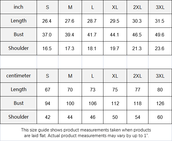 | Centimeter | S | M | L | XL | 2XL | 3XL |